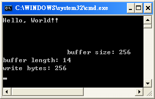 在此我們看到,實際上 buffer 長度雖為14,但當時在宣告時就用了 256 bytes,而用 ConsoleWrite 時,寫入的 bytes 是調用 sizeof(buffer),於是寫了 256 個字元進去。在此需特別注意,此程式不支援批次檔處理。如今寫一個 a.bat ,內容為 "HelloWorld.exe > a.txt",其結果將會是 "WriteConsole Error!!"。